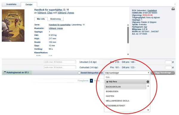 BTJ:s butik är baserad på kundvagnar/kundnummer. Eftersom man kan se varandras varukorgar kan man också samarbeta. Men tänk på att du behöver välja vilken kundvagn/mottagare du handlar i. se bild: